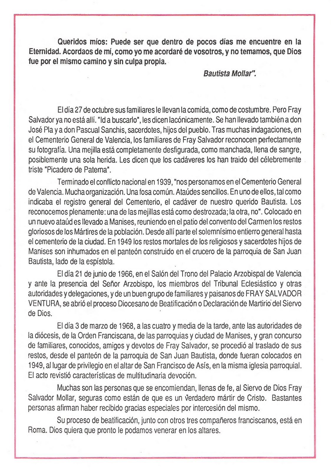 Biografía aportada por Salvador Vilar Aliaga, el cual en su carta me dice:En las fotografías se puede ver a las personas que le acompañaban en la verificación solicitada, así como los diferentes pasos que tuvieron lugar hasta enterrarlo en el altar que ahora ocupa.