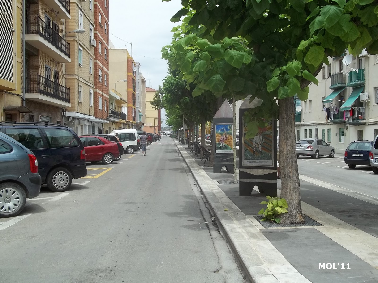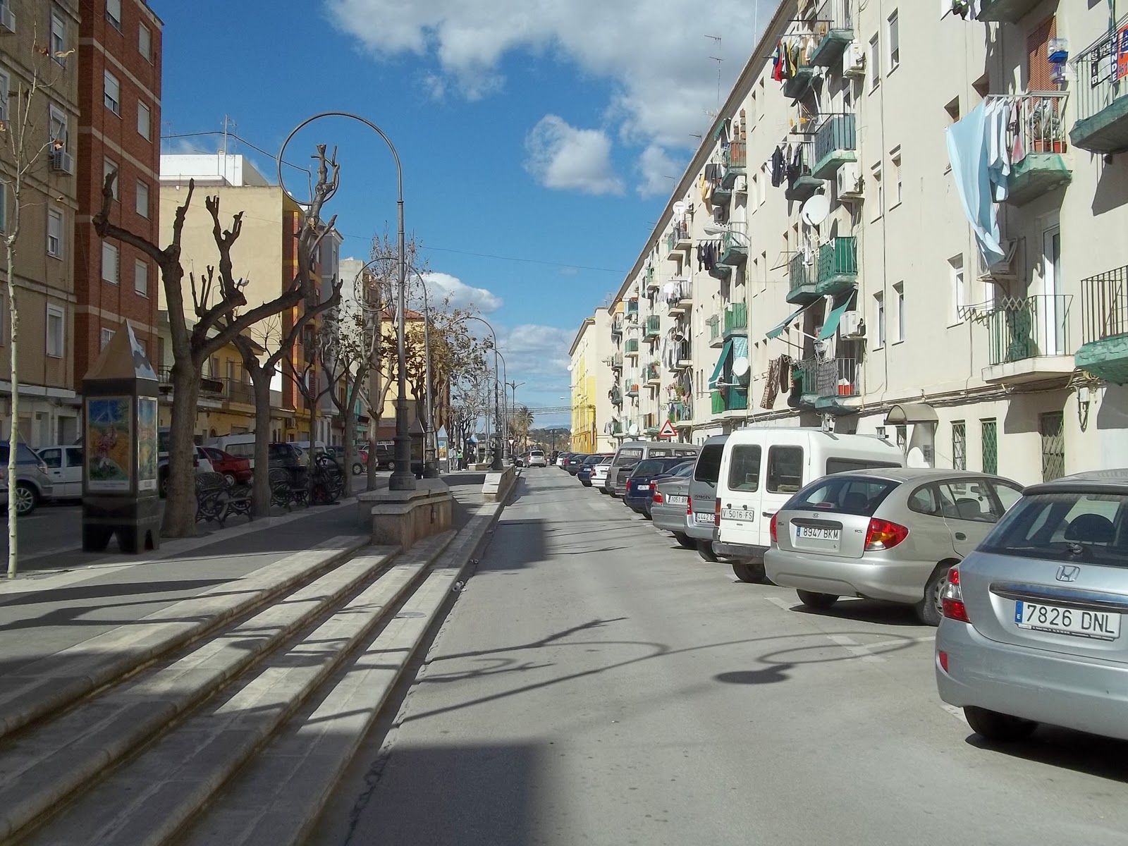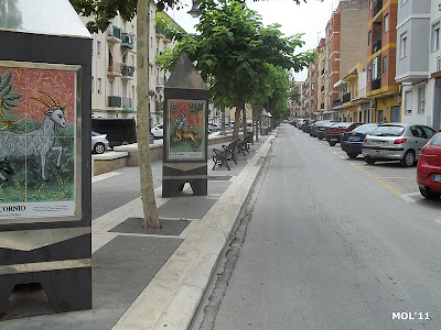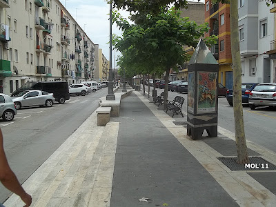 Vista de la ancha avenida, que como se puede observar -la calzada- está a dos niveles, en el centro existen unos monolitos de cerámica, pintados por Juan Colón.