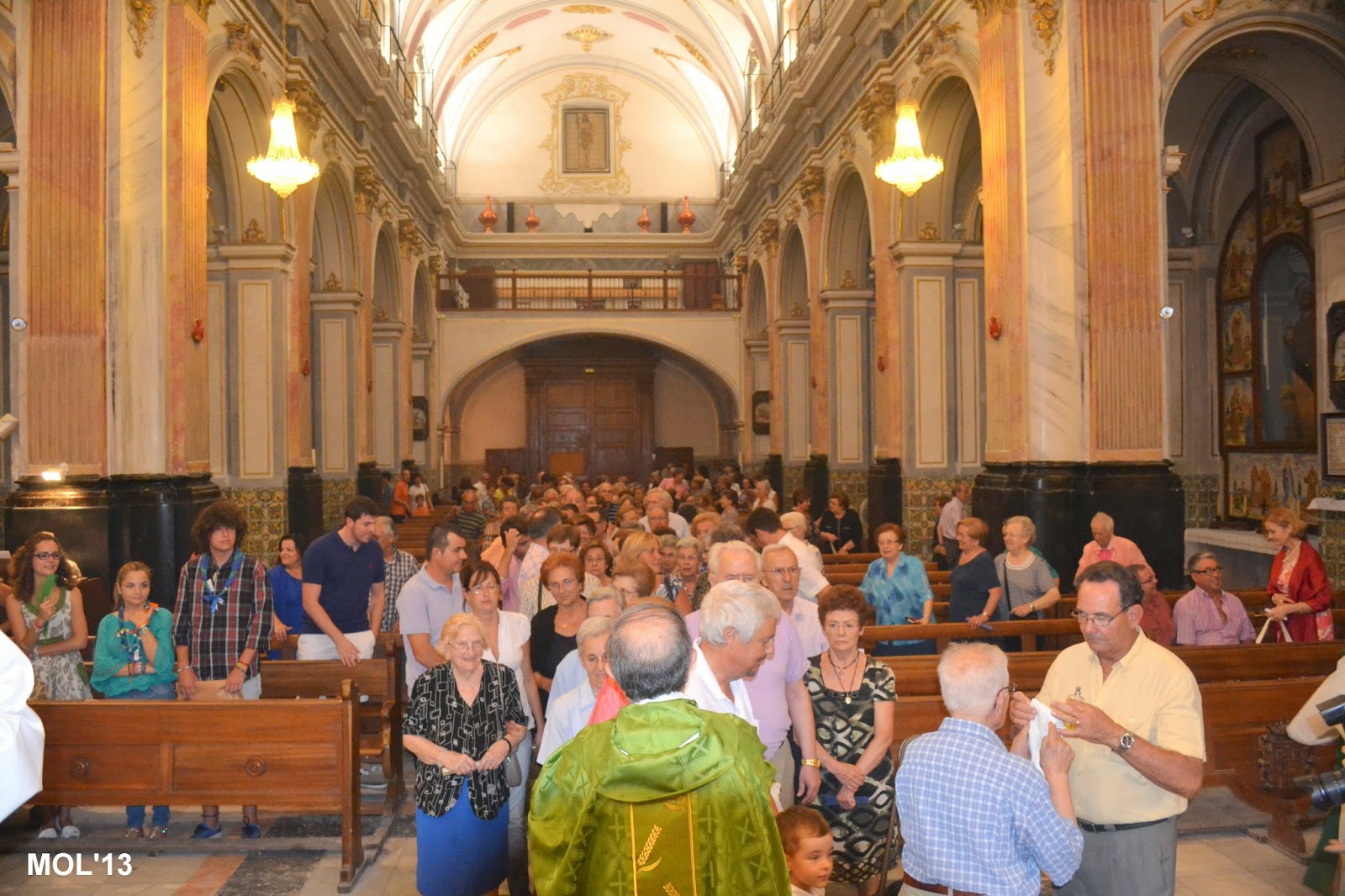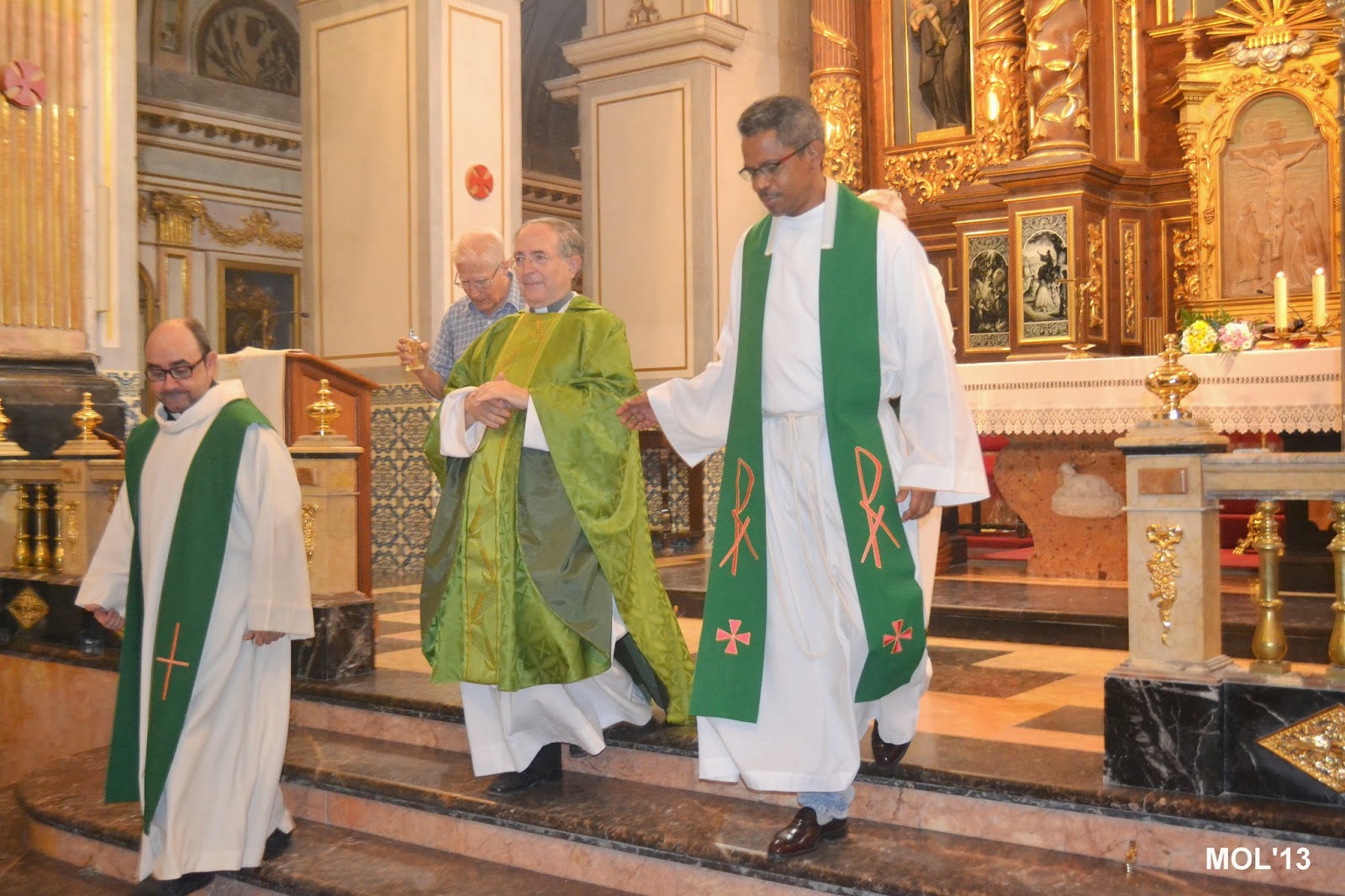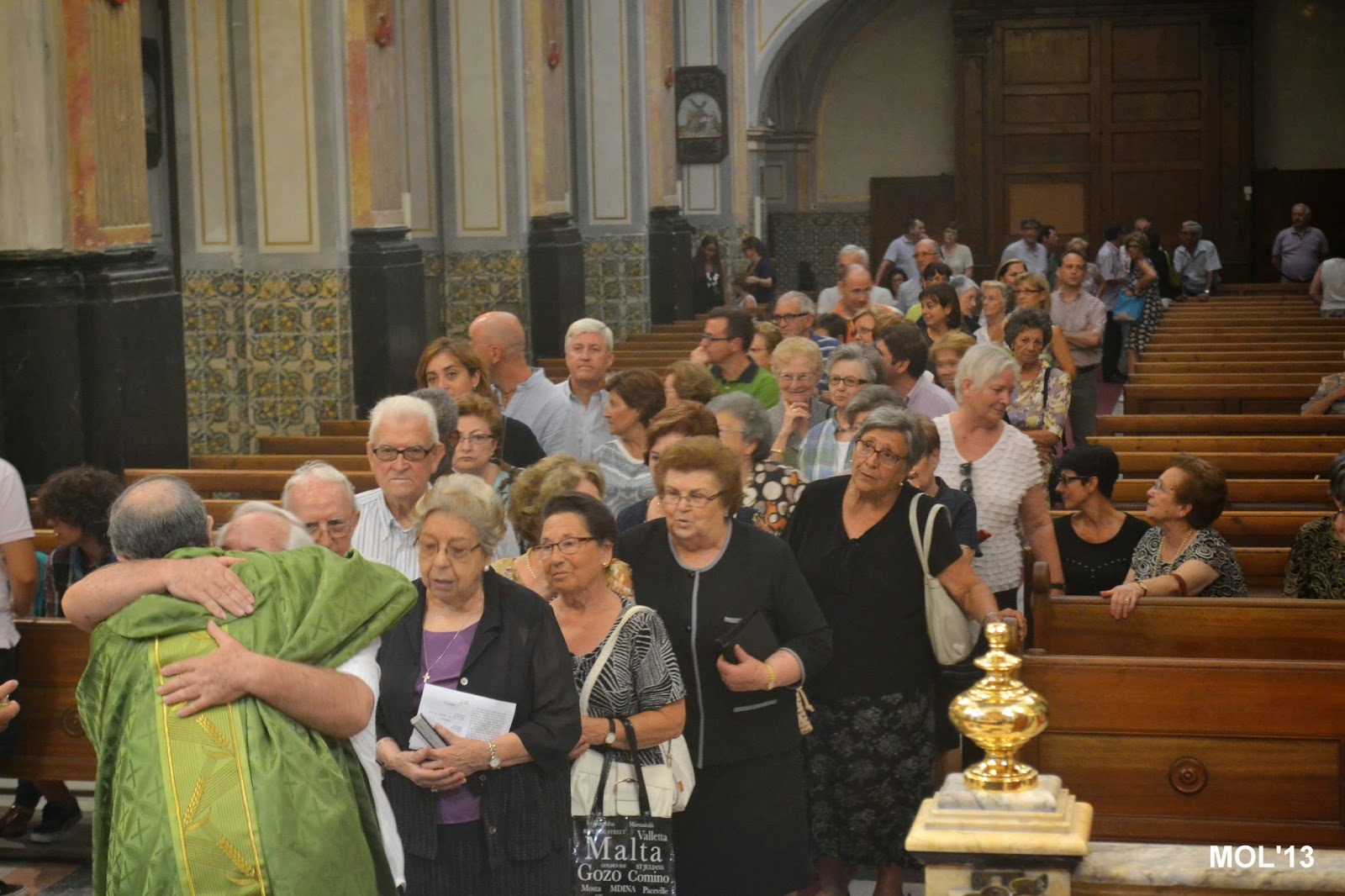 La Iglesia -para la fecha que era- estaba llena de feligreses que querían despedirse de Don Valentín, después de los muchos años que lleva entre nosotros. Estaba acompañado de sacerdotes amigos y de Don Juan Ávila, sacerdote colombiano que está ayudando en las labores sacerdotales en nuestra parroquia, al mismo tiempo que realiza sus estudios en la Universidad de Valencia, antes de partir (son 2 años) en el 2014, para su país.