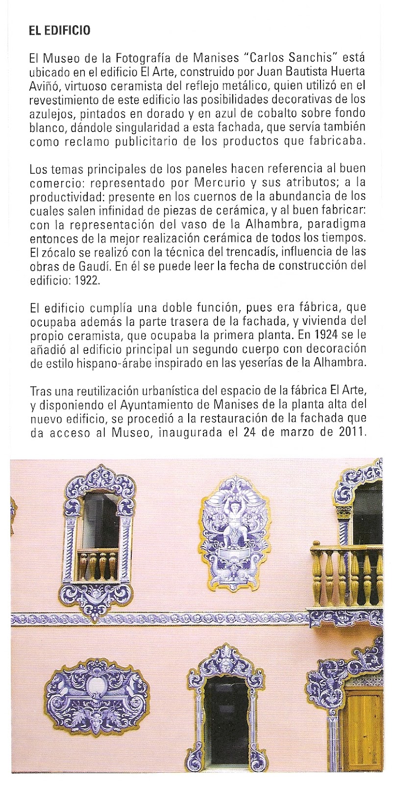 En el correu electronic es donava informacio sobre els detalls de la restauracio, aixina com els autors -artesans ceramistes- que s'anaven a fer carrer de tornar a la seua construccio original, la de 1922 ( el cos central ) i l'afegit en 1924 ( la part dreta, mirat la foto ), tapant les portes, finestres i balcons, i restaurant els panels de taulells-medallons, que en sa construccio original tenia.
