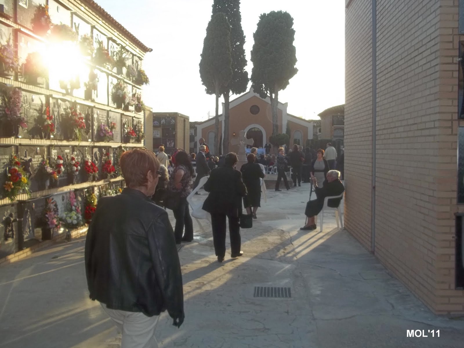 La visita al cementerio –que este año cumple 98, ya que fue inaugurado el 13 de Agosto de 1913- ha sido una constante durante los últimos 15 días, ya que los familiares se han acercado a limpiar y adecentar los nichos. Las flores inundaban todo el cementerio y durante todo el día ( no se cerraba a medio día ) en todas las puertas de acceso era un completo e incesante ir y venir de personas, familias enteras, que se acercaban a rezar a sus seres queridos. El extenso aparcamiento que ha quedado alrededor, después de la ampliación del cementerio, ha estado todo el día completamente lleno.
