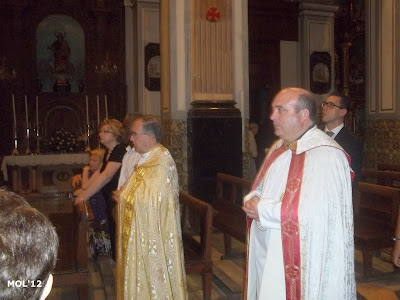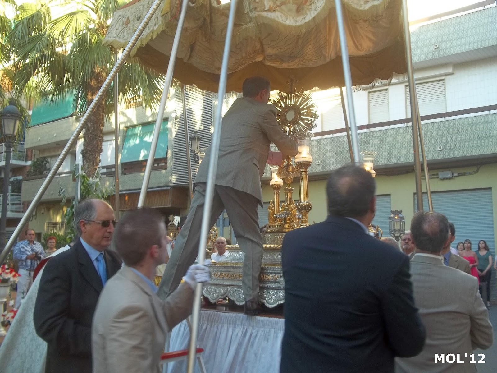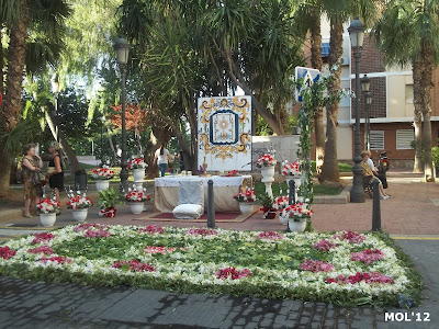 Como se pudo observar, y ahora se muestra en las fotografías, en la Plaça del Castell se levanta un artístico altar ( delante del monumento al Obispo Soler ), para que la procesión que viene por el Carrer Major, Obispo Soler y Carrer del Sagrari, haga un alto y tengan lugar los actos litúrgicos propios de la fiesta. Una vez finalizados los actos litúrgicos, la procesión continúa por las calles de nuestra Parroquia, hasta llegar a la Plaza de la Iglesia, acompañada por los niños y niñas de Primera Comunión, familiares y feligreses.
